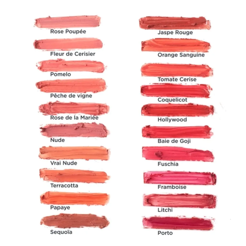 RICINUS COMMUNIS (CASTOR) ZAADOLIE, SIMMONDSIA CHINENSIS (JOJOBA) ZAADOLIE*, BIJENWAS*, COPERNICIA CERIFERA (CARNAUBA) WAS*, ORYZA SATIVA (RIJST) ZETMEEL*, OCTYLDODECANOL, ARGANIA SPINOSA KERNOLIE, EUPHORBIA CERIFERA (CANDELILLA) WAS, BUTYROSPERMUM PARKII (SHEA) BOTER, MACADAMIA INTEGRIFOLIA ZAADOLIE*, SILICIUMDIOXIDE, GEHYDROGENEERDE PLANTAARDIGE OLIE, OLIEZUUR/LINOLEENZUUR/LINOLEENZUURPOLYGLYCERIDEN, PARFUM, TOCOFEROL, GEHYDROLYSEERD NATRIUMHYALURONAAT, HELIANTHUS ANNUUS (ZONNEBLOEM) ZAADOLIE, NATRIUMHYALURONAAT, KAOLIEN, GEHYDROGENEERDE RICINUSOLIE, LINALOOL, CITRONELLOL, CI 77891 (TITANIUMDIOXIDE), CI 77491 (IJZEROXIDEN), CI 77492 (IJZEROXIDEN), CI 77499 (IJZEROXIDEN), CI 75470 (KARMIJN), CI 77742 (MANGAANVIOLET). En voor degenen die geen Latijn hebben gehad op school, hier zijn de ingrediënten in het Frans: Ricinuszaadolie, Jojobazaadolie*, Bijenwas*, Carnauba (palm)was*, Rijstzetmeel*, Octyldodecanol, Arganolie, Candelillawas, Sheaboter, Macadamianootolie*, Silica, Gehydrogeneerde plantaardige olie, Oliezuur/Linoleenzuur/Linoleenzuurpolyglyceriden, Parfum, Tocoferol (Vitamine E), Gehydrolyseerd natriumhyaluronaat, Zonnebloemzaadolie, Natriumhyaluronaat (zout van hyaluronzuur), Kaolien (klei), Gehydrogeneerde ricinusolie, Linalol, Citronellol, Titaandioxide (Kleurstof), IJzertrioxide, IJzertetraoxide, Karmijn, Ammonium mangaandifosfaat. * : * Ingrediënten van biologische landbouw Certificering: Cosmetisch product gecertificeerd Cosmos Organic door Ecocert Greenlife. 100% van alle ingrediënten zijn van natuurlijke oorsprong. 77% van alle ingrediënten zijn afkomstig van biologische landbouw. Milieueigenschappen en kenmerken van de verpakking: Verpakking met minstens 100% gerecycled materiaal. Productieplaats: Italië |