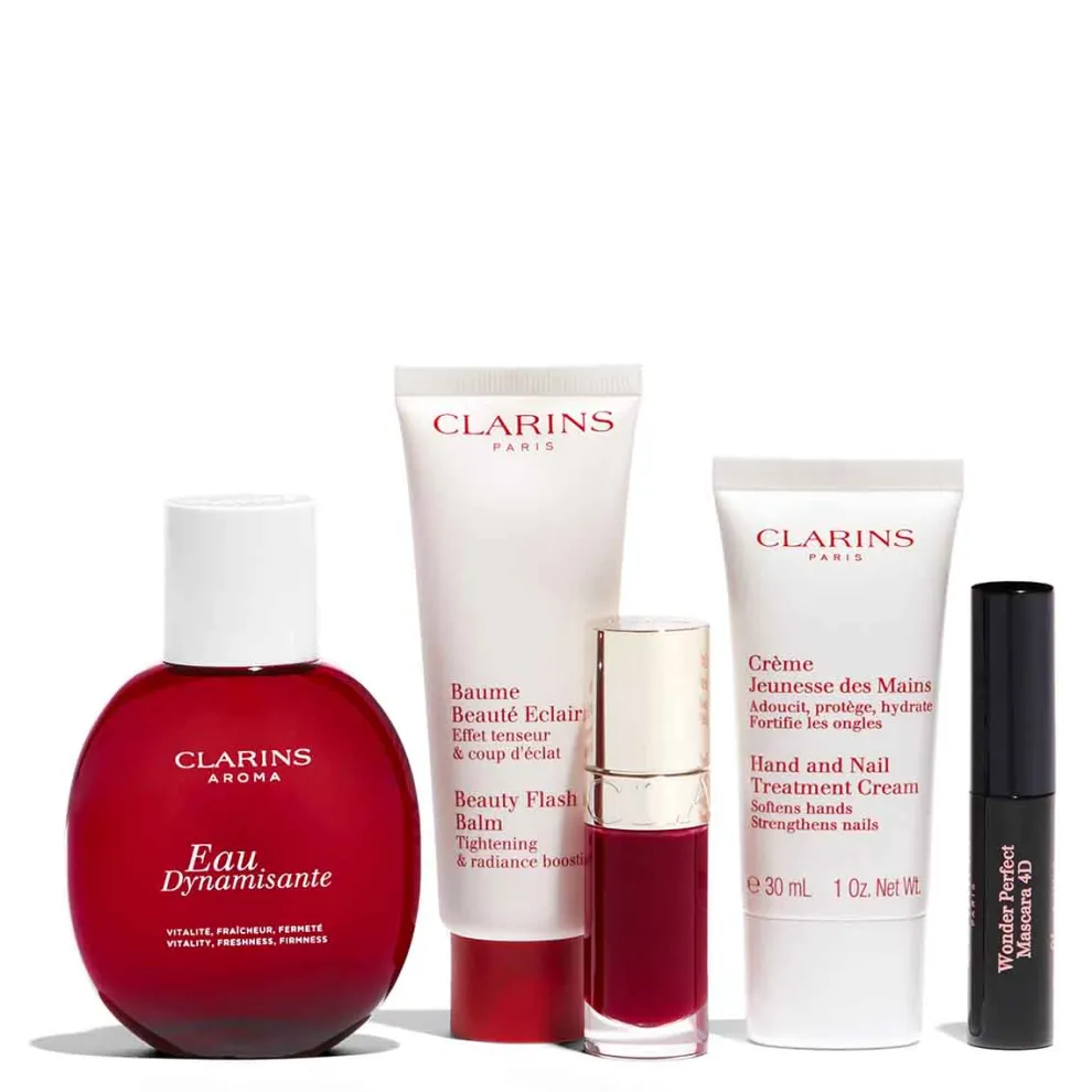Eau Dynamisante : De huid is subtiel geparfumeerd, getonifieerd en verstevigd. Beauty Flash Balm: laat de teint onmiddellijk stralen en de trekken tot rust komen. De huid is zacht en gehydrateerd. Dag na dag ziet de huid er mooier uit, de teint is stralend en tekenen van vermoeidheid vervagen. Lip Comfort Oil: je lippen worden onmiddellijk en langdurig verzacht, gekalmeerd en gehydrateerd. Crème Jeunesse des Mains: zachte, soepele handen die perfect worden gladgestreken. Wonder Perfect 4D Mascara: volume, lengte, krul, high definition. |
