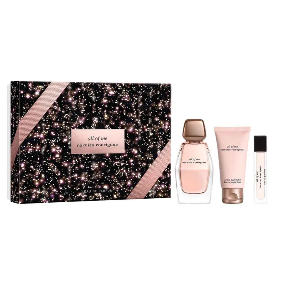 All of Me Christmas Geschenkset Eau de Parfum van Narciso Rodriguez Vrolijk de feestdagen op en verras je geliefden met een unieke geurgeschenkset van Narciso Rodriguez! Een feestelijke, nachtelijke mijmering die de meest schitterende geschenken tot leven brengt. Laat je inspireren door de bruisendheid van een stad die barst van het licht. Deze vrouwengeschenkset bevat : – Een all of me Eau de Parfum 90ml – Een all of me Body Lotion 50ml – Een all of me Travel Spray 10ml Elke geurnoot van de all of me damesgeur drukt zich duidelijk, oprecht en ongecompliceerd uit. Het spoor opent met een kostbare infusie van verse rozenblaadjes, verrijkt met de essentie van magnolia en zwarte iris. Deze bloemige mix wordt gevolgd door gedurfde noten van geranium en delicate, romige witte muskus. Tot slot sluit de betoverende warmte van sandelhout dit verslavende spoor. Less is more, in een 100% kartonnen doos. Narciso Rodriguez is bewuster omgegaan met het ontwerp van zijn sets. We moedigen je aan om je sets een tweede leven te geven, door ze te hergebruiken of te sorteren.