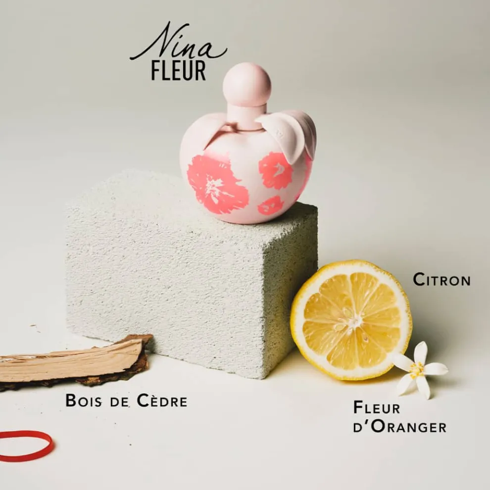 “Geïnspireerd door de mode en ontworpen als een symbool van optimisme, is Nina Fleur Nina Ricci’s nieuwe fruitige bloemige Eau de Toilette, veganistisch en schoon*.
