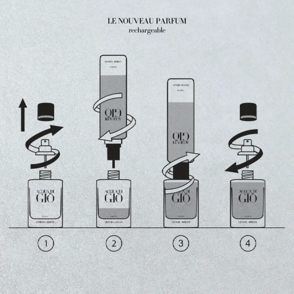 De nieuwe ACQUA DI GIÒ PARFUM flacon heeft een zwart kleurverloop en een dop met het Giorgio Armani monogram. Nu hervulbaar in alle formaten met de 150 ml navulling, weerspiegelt het Giorgio Armani’s toewijding aan de planeet en zijn visie van meer verantwoorde luxe.