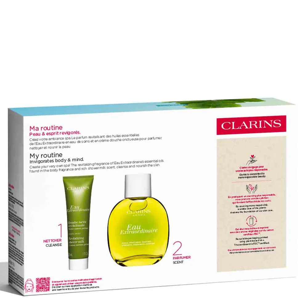 Deze box bevat Eau Extraordinaire, Clarins nieuwste Eau de Soins, en een douchecrème met de revitaliserende geur van Eau Extraordinaire geformuleerd met biologische zoete amandelolie. Deze Inner Strength Ritual parfumeert, doet innerlijke kracht herleven en prikkelt de zintuigen. De geur neemt je mee naar het hart van de plantenwereld van Clarins en nodigt je uit om opnieuw contact te maken met jezelf.