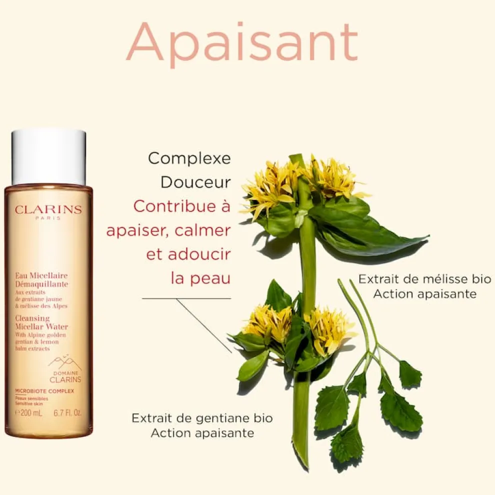Het zachte complex in de formule van deze make-up remover combineert twee planten die op ons Clarins landgoed groeien: biologische gele gentiaan en biologische citroenmelisse. HET CLARINS ESTATE: EEN OPEN KADERLABORATORIUM