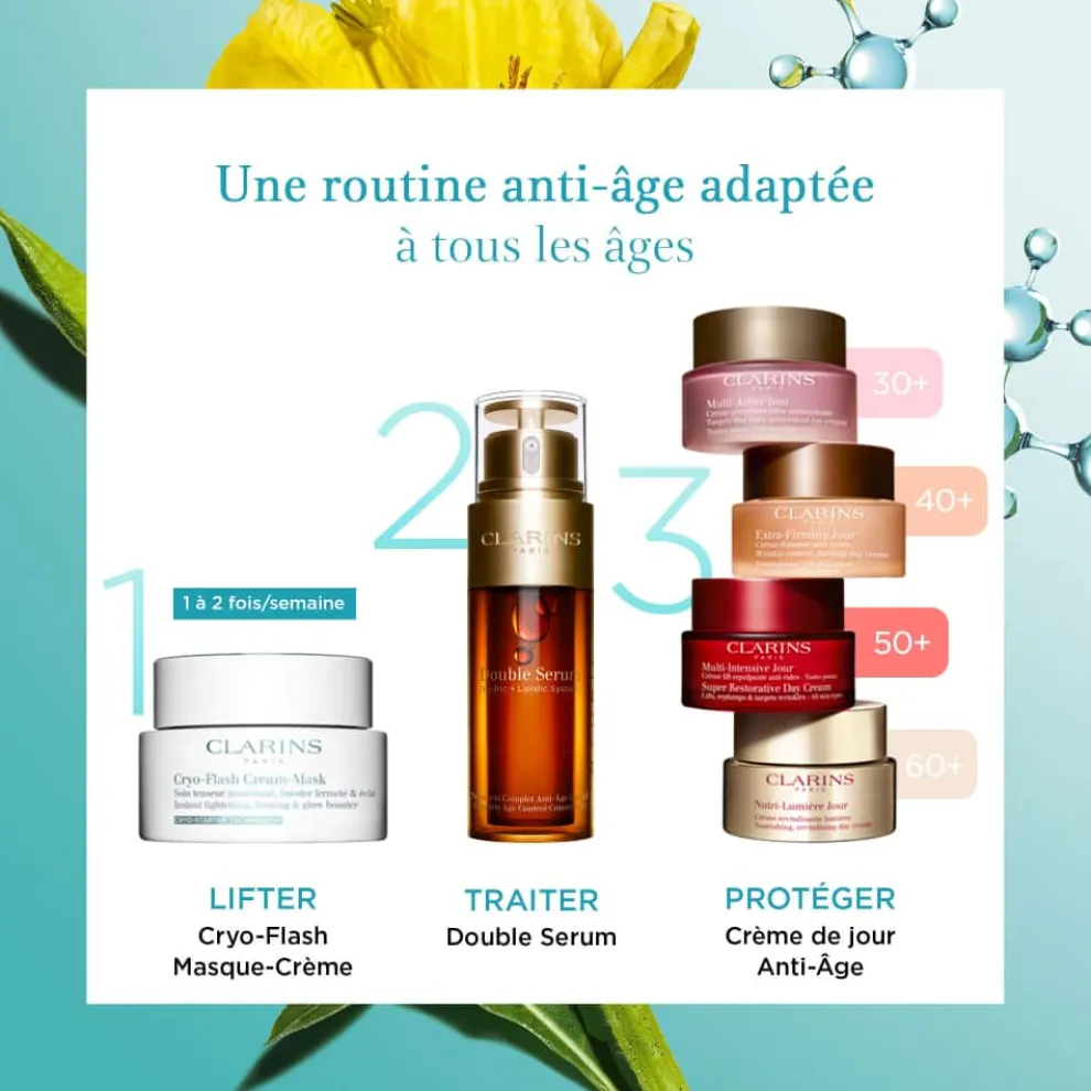 Clarins Laboratories hebben een dubbele moleculaire en plantaardige technologie ontwikkeld die in staat is de mechanismen van koude op de huid te reproduceren om de tekenen van veroudering te bestrijden: INNOVATIE CRYO-STARTER TECHNOLOGIE bestaande uit een duo van belangrijke actieve bestanddelen: M.G.A.-molecule, afkomstig van menthol + teunisbloem-extract.