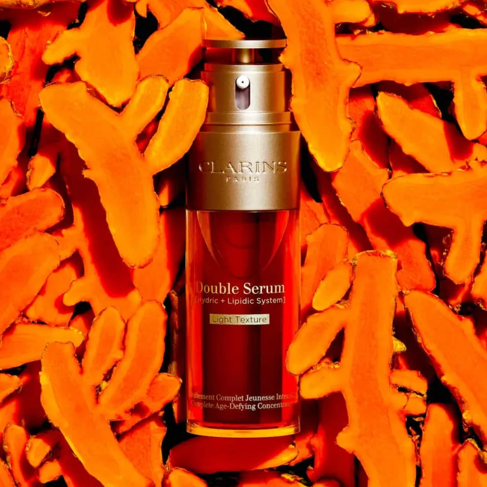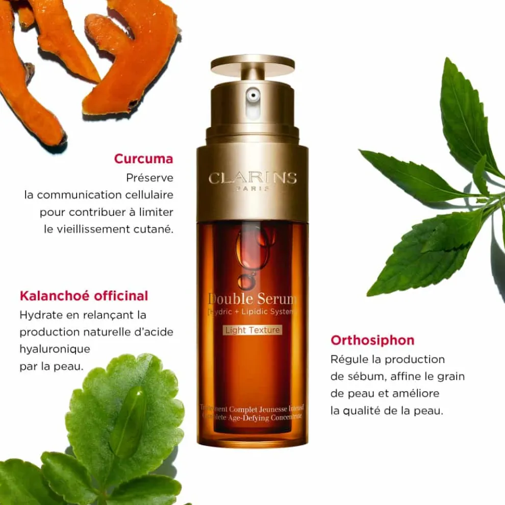 Double Serum Light Texture is samengesteld uit een unieke dubbele formule die [20+1] plantenextracten combineert met de krachtigste anti-aging werkstoffen, waaronder kurkuma-extract om de 5 vitale functies van de huid te stimuleren: regeneratie, voeding, oxygenatie, hydratatie en bescherming. Twee serums in één om in te werken op de zichtbare tekenen van veroudering.