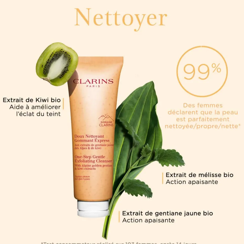 Clarins make-up removers, de 1e schoonheidsstap met plantenextracten. Deze 3-in-1 express scrub reinigt mild, verwijdert make-up en exfolieert terwijl het de huid in balans helpt te houden.