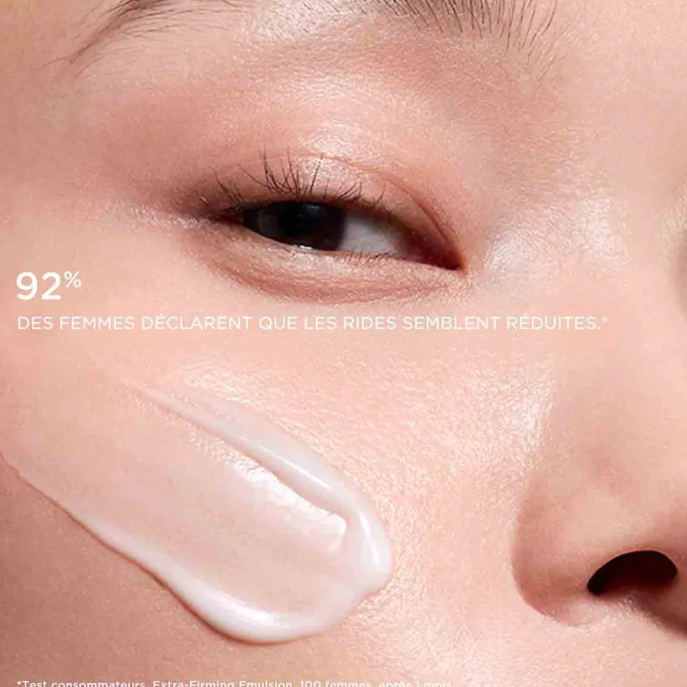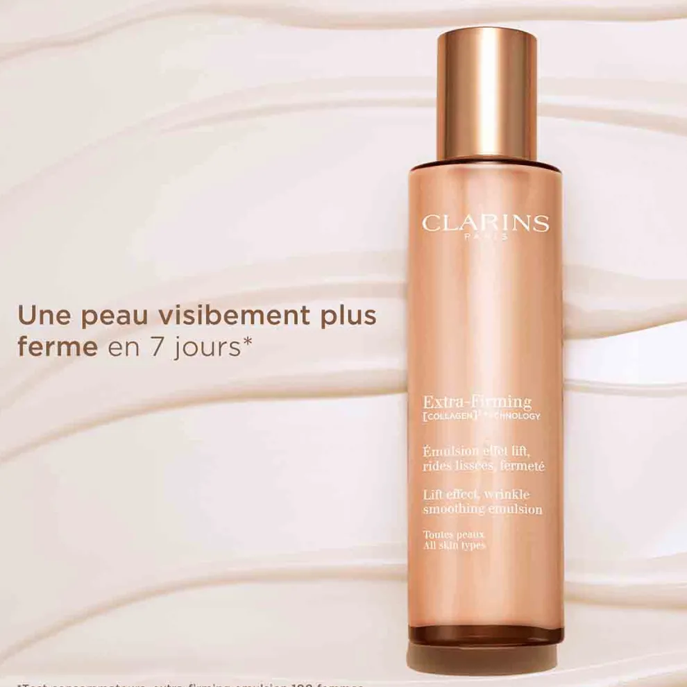 *Ex vivo test uitgevoerd op gefotoverouderde huidexplantaten, waarbij de hoeveelheid collageen van goede kwaliteit en met een goede structuur werd gemeten **Consumententest, Extra-Firming Day & Night voor alle huidtypes, 107 vrouwen ***Bij Clarins ****Vergelijking tussen 3 volle potten Extra-Firming en 1 volle pot die twee keer is bijgevuld. Gebaseerd op een unieke score berekend op basis van een levenscyclusanalyse.