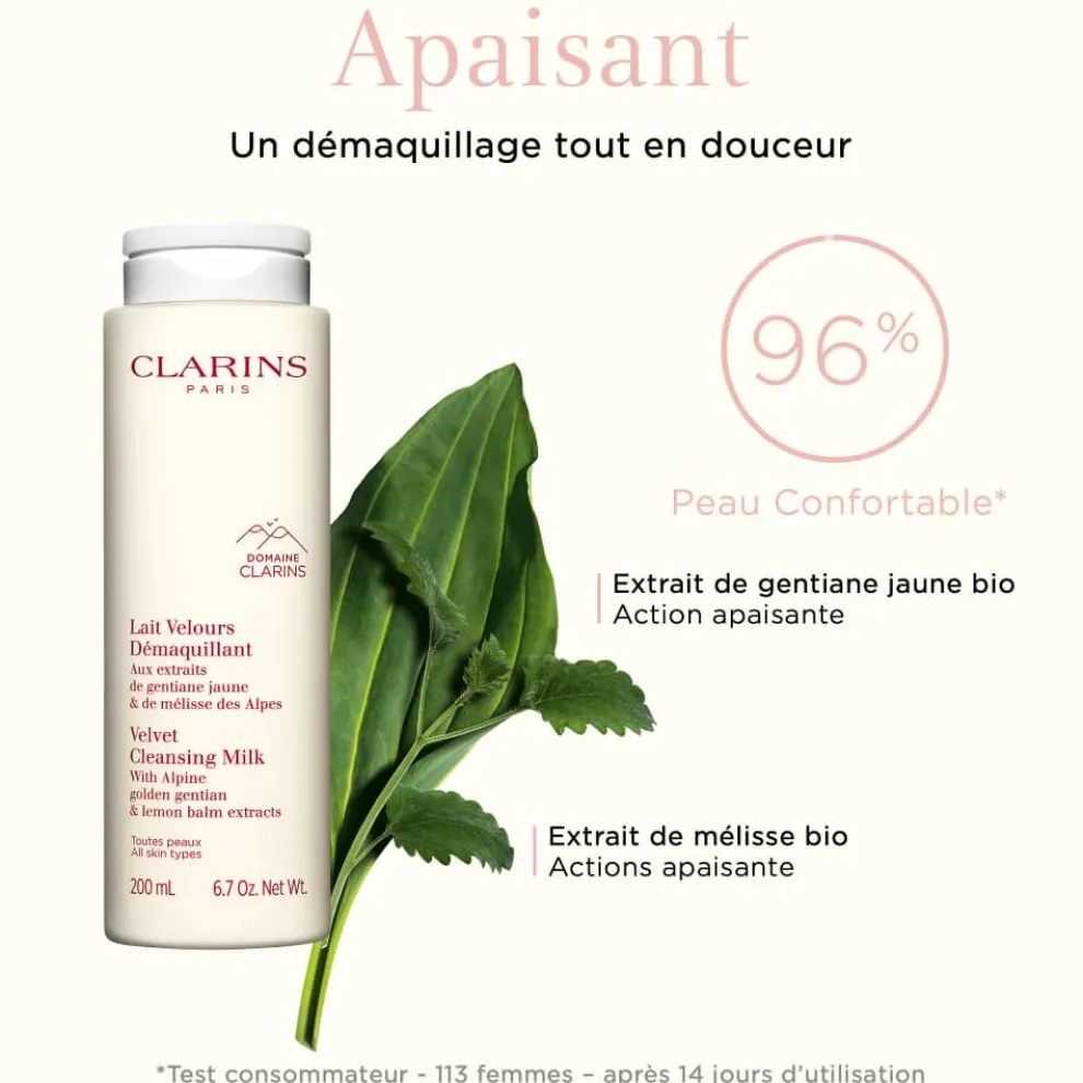 Velvet Cleansing Milk is een romige, niet-vette melk, ideaal voor de Clarins anti-vervuilingsmake-up verwijderingsmethode. Rijk aan kalmerende ALPINE kruiden en zuiverende MORINGUA, verwijdert het lichte make-up van de teint, ogen en lippen, verwijdert het onzuiverheden en vervuilende deeltjes en behoudt het de microbiota en hydrolipidenfilm van de huid.