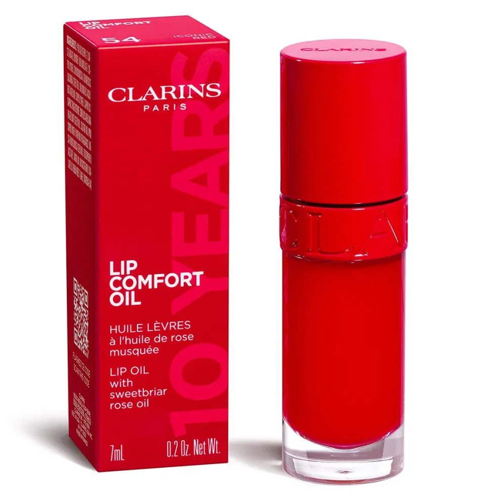 Om de 10e verjaardag te vieren, is Lip Comfort Oil opnieuw uitgevonden in een gelimiteerde editie. Een kenmerkend rood Clarins, in de tint “54 Iconic Red” als eerbetoon aan de geboortedatum van het merk. Voor de gelegenheid heeft het een flamboyante look, van de fles tot de dop.