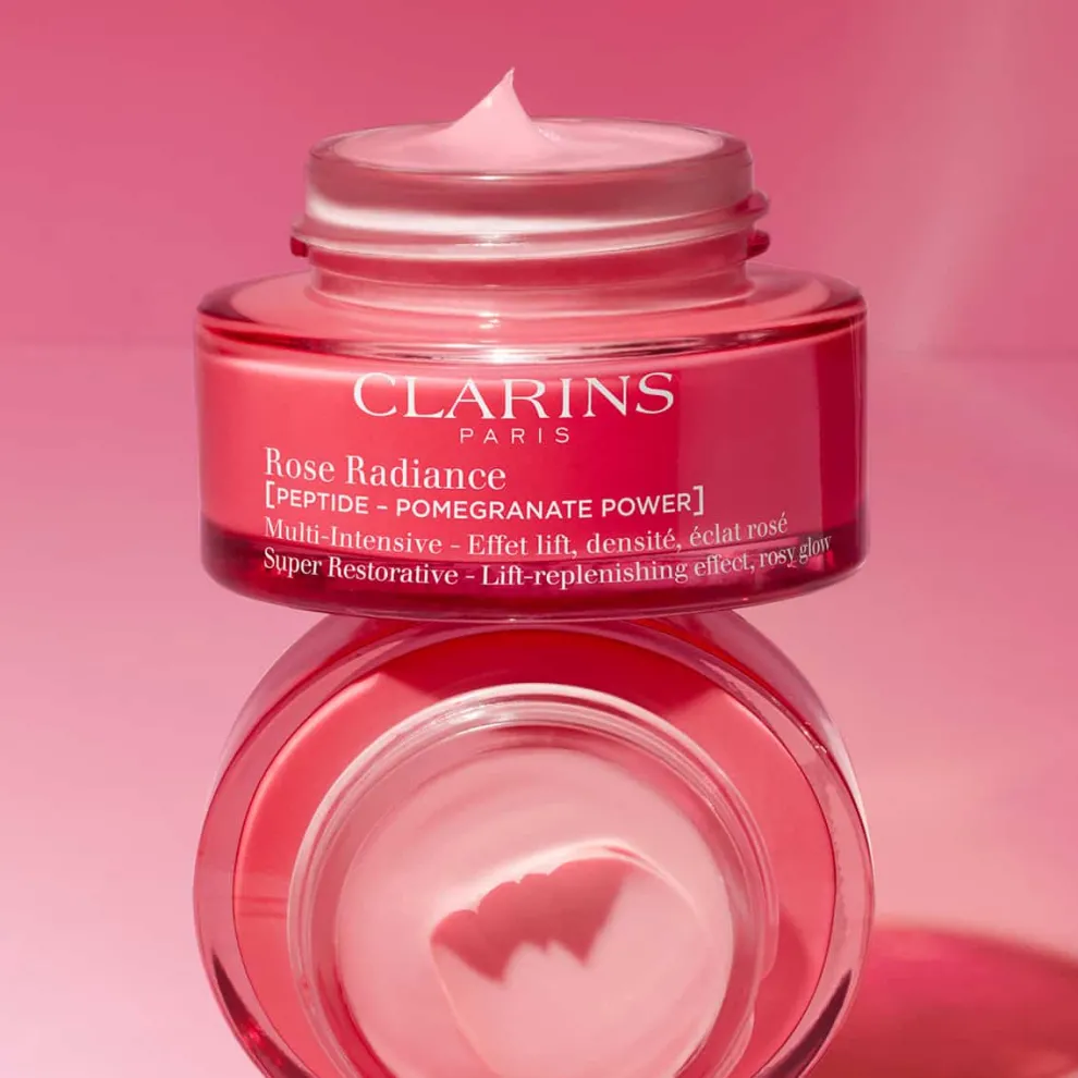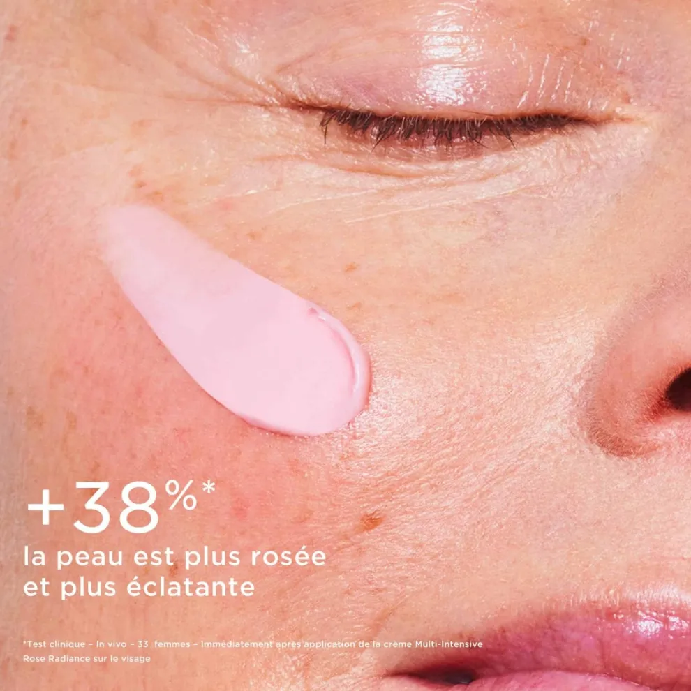 Laat je huid er weer jong en stralend uitzien. Een dagverzorging met een verstevigend effect die de huid, verzwakt door hormonale veranderingen als gevolg van het ouder worden, weer doet stralen, voor een liftend en opvullend effect en een onmiddellijke rozige gloed. Multi-Intensive Rose Lumière wordt Multi-Intensive Rose Radiance. Een dubbele anti-aging en stralende werking in een formule die voor 93% bestaat uit ingrediënten van natuurlijke oorsprong. De kern van de formule, het nieuwe complex [BRIGHTNESS PEPTIDE + ORGANISCH POMEGRANATE EXTRACT] voor een stralende, egale teint: – Radiance Peptide werkt in op de glans en egaliteit van de huid. – Biologisch granaatappelextract: energetiserende en antioxiderende werking. Verhoogt de energie van de huid. De huid is gladder, reflecteert het licht beter en komt tot leven met een rozige gloed voor een onmiddellijke gezonde gloed. Clarins heeft ook biologische Gorse en biologische Harungana extracten gecombineerd om de verslapping van de huid, veroorzaakt door de daling van hormonen tijdens de menopauze, aan te pakken. Organisch Harungana-extract dat even effectief is als retinol* stimuleert de collageen I-synthese met een factor 12**. – Biologisch Gorse-extract, bekend om zijn anti-verslappende eigenschappen. De huid ziet er verstevigd uit en wordt weer stevig. De rozige tint van Multi-Intensive Rose Radiance crème werkt als een energiebooster voor de huid en de geest, en biedt een onmiddellijk verfraaiend effect dat de uitstraling van alle vrouwen doet opleven, ongeacht hun huidtype en teint. Een romige, omhullende textuur die geen vettig laagje achterlaat. Voor wie? Alle vrouwen boven de 50 die hormonale veranderingen doormaken die gepaard gaan met de menopauze en die op zoek zijn naar een antiverouderingsproduct dat een verstevigende werking combineert met een gezonde gloed. *Vergelijkend klinisch onderzoek naar de effectiviteit tegen rimpels en gladheid bij 46 vrouwen die gedurende 56 dagen een basis aanbrachten met ofwel organisch harungana-extract ofwel retinol met hetzelfde percentage ingrediënten als in het eindproduct **In-vitrotest op type 1 collageen.
