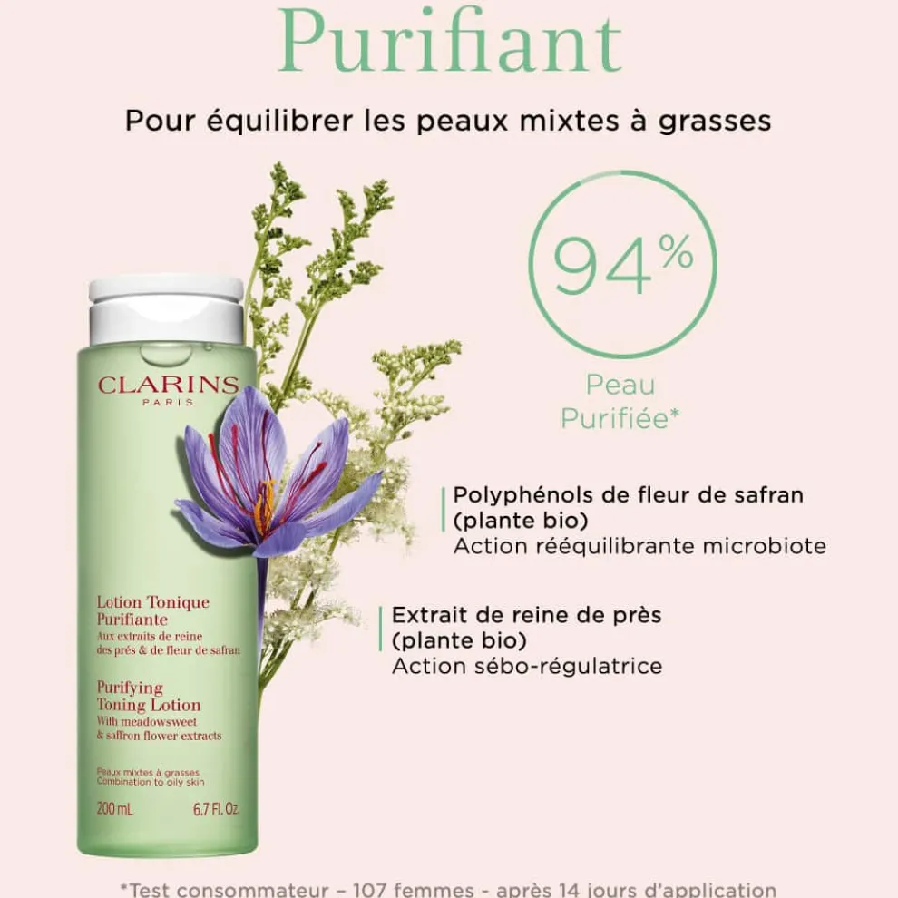 Deze alcoholvrije toner, verrijkt met moerasspirea en toverhazelaarextracten, is de laatste stap in het verwijderen van make-up en verwijdert make-upresten terwijl de huid wordt gekalmeerd en gerustgesteld. Maar dat is nog niet alles… Omdat het [Microbiote Complex] bevat, optimaliseert het de balans van de microbiota van de huid en versterkt het de natuurlijke afweer, voor een gezondere huid. Clarins tonifiërende lotion maakt het verwijderen van make-up compleet en hydrateert, verzacht en kalmeert de huid dankzij een cocktail van planten