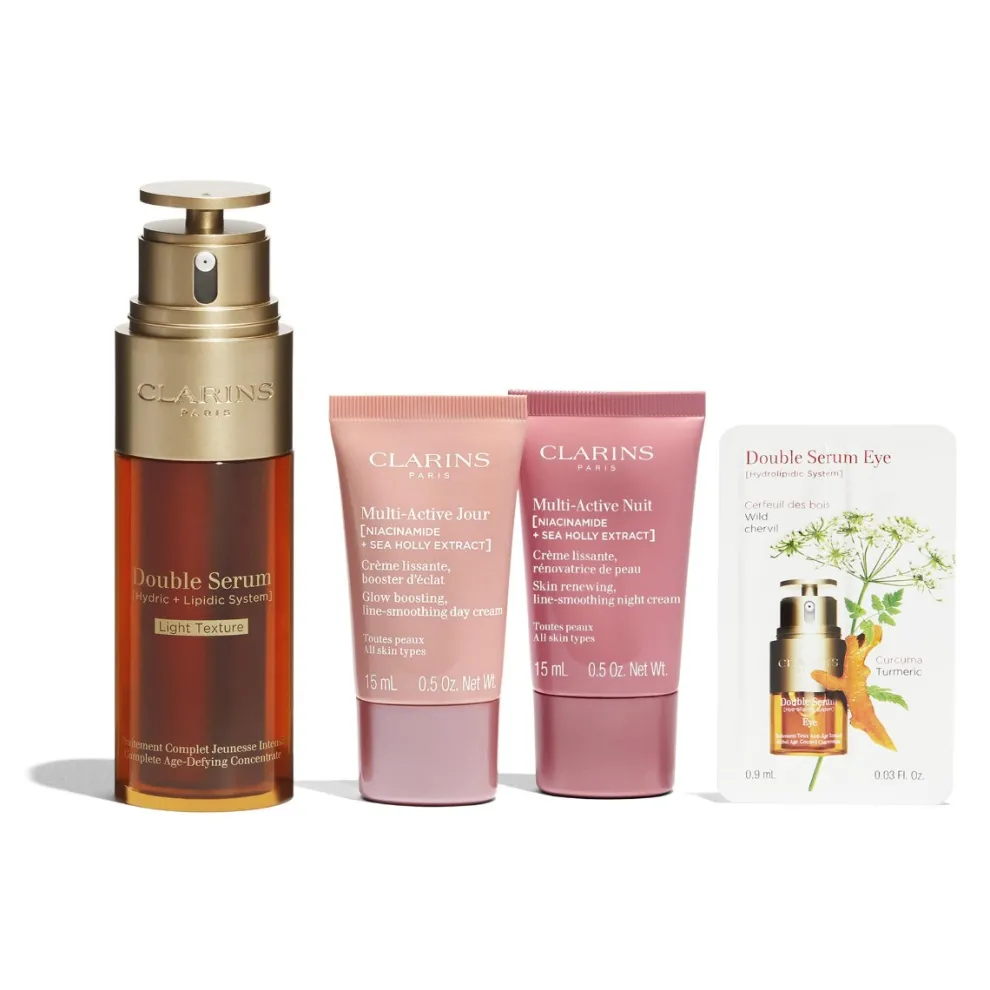 Deze set bevat : Double Serum Light Texture 50ml Multi-Active Day Alle huidtypes 15 ml Multi-Active Night Alle huidtypes 15 ml Double Serum Eye proefzakje 0,9 ml