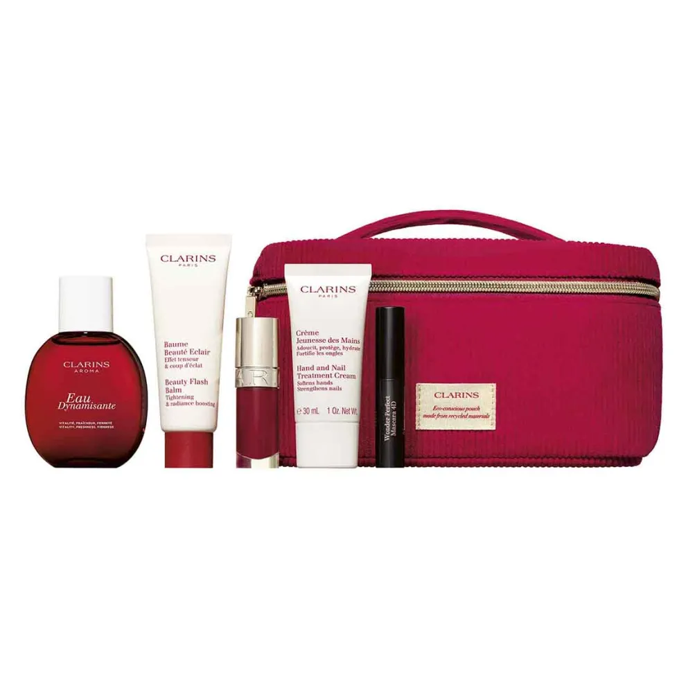 Eau Dynamisante : De huid is subtiel geparfumeerd, getonifieerd en verstevigd. Beauty Flash Balm: laat de teint onmiddellijk stralen en de trekken tot rust komen. De huid is zacht en gehydrateerd. Dag na dag ziet de huid er mooier uit, de teint is stralend en tekenen van vermoeidheid vervagen. Lip Comfort Oil: je lippen worden onmiddellijk en langdurig verzacht, gekalmeerd en gehydrateerd. Crème Jeunesse des Mains: zachte, soepele handen die perfect worden gladgestreken. Wonder Perfect 4D Mascara: volume, lengte, krul, high definition. |