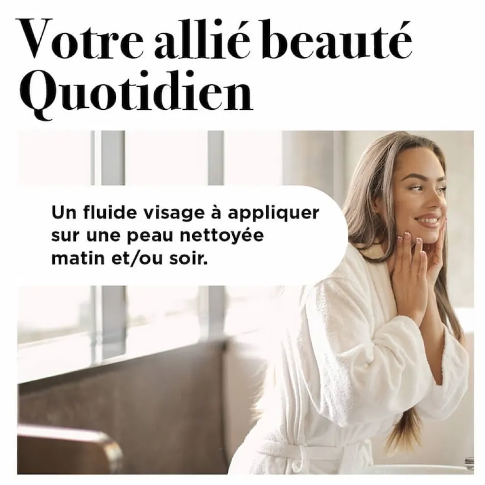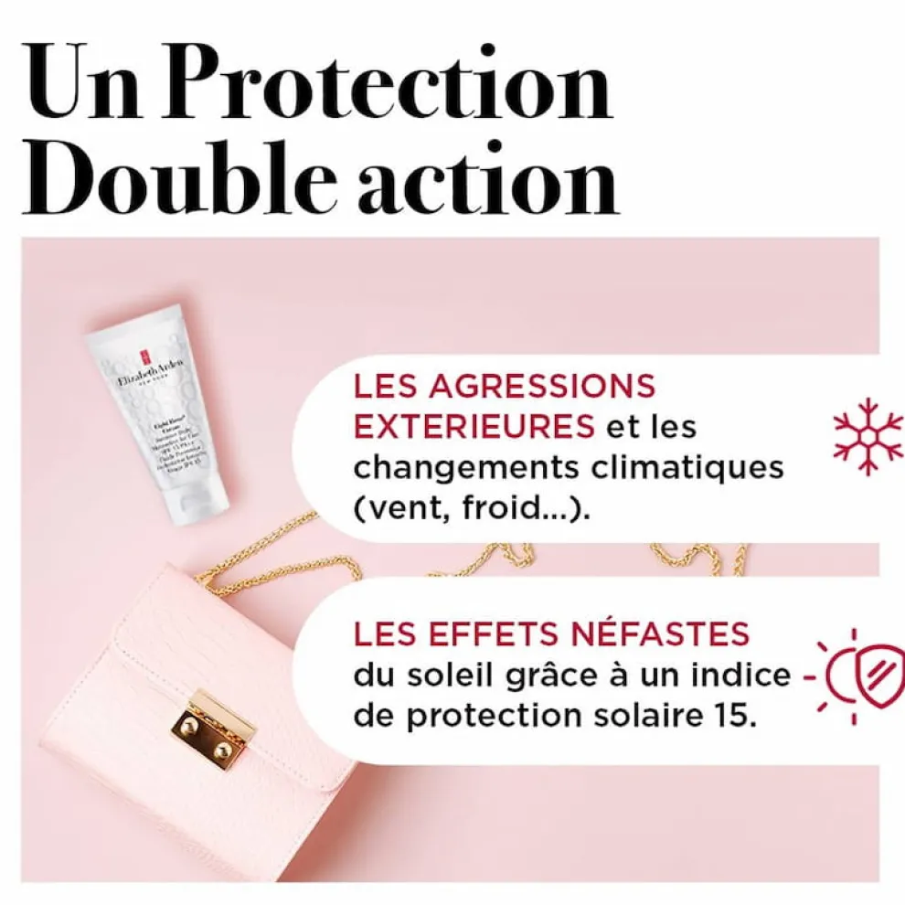 Het beschermt de huid tegen externe agressies en klimaatveranderingen (zon, wind, kou) en beschermt ook tegen de schadelijke effecten van de zon dankzij een zonbeschermingsfactor 15.