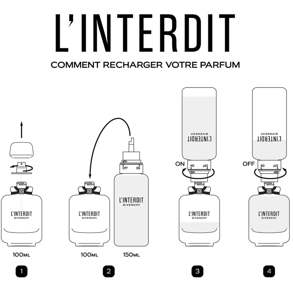 Ga voorbij de conventies en ontdek L’Interdit Eau de Parfum voor vrouwen. Deze onverschrokken geur bevestigt durf als de sleutel tot vrijheid. Niets en niemand kan je tegenhouden. Deze geur voor vrouwen met noten van witte bloemen wordt versterkt door een donker akkoord om de eerste Underground Flower te creëren. Sensuele noten van oranjebloesem, jasmijn en tuberoos vermengen zich met een donkere en raadselachtige combinatie van vetiver en patchoeli. L’Interdit Eau de Parfum van Givenchy is verslavend en gedurfd elegant. De brutale flacon is een bevestiging van vrijheid. Het is uiterst eenvoudig, diep vrouwelijk en resoluut modern en brengt in een eigentijdse versie het eerste parfum voor vrouwen terug dat Hubert de Givenchy in 1957 creëerde. L’Interdit is een eerbetoon aan gedurfde vrouwelijkheid. Een uitnodiging om je grenzen te verleggen en de opwinding van het verbodene te ontdekken. L’Interdit Eau de Parfum voor vrouwen is nu verkrijgbaar in een navulbaar formaat van 100 ml (het enige formaat dat compatibel is met de navulling van 150 ml). Vul je L’Interdit Eau de Parfum 100ml flacon met de vermelding “RECHARGEABLE” eenvoudig bij met de L’Interdit Eau de Parfum 150ml Navulling.
