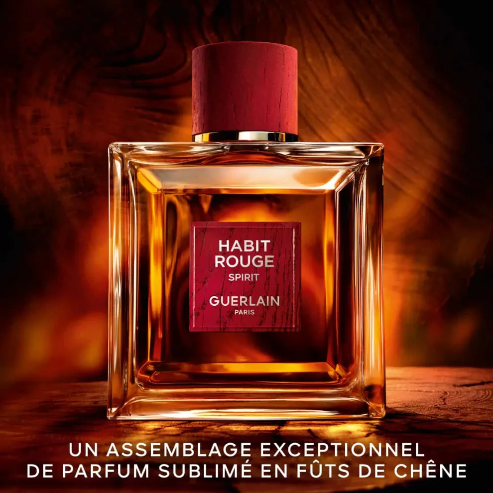 Delphine Jelk, creatief directeur van Guerlain Parfums & Parfumeure, viert de pioniersgeest van het Huis door een nieuw Guerlain-proces in te wijden voor het mengen van parfums die gesublimeerd zijn in eikenhouten vaten en doordrenkt met hun karakteristieke houtnoten. Habit Rouge Spirit drukt de visie uit van een luxe die zeldzaam is geworden: tijd. Door langdurig contact met het hout ontwikkelt deze nieuwe variatie zijn karakteristieke noten. Dit wordt gevolgd door een zorgvuldige menging om de ideale balans te vinden tussen de geuren van de twee vaten, waardoor een unieke compositie ontstaat die een nieuwe signatuur geeft aan de iconische Habit Rouge.