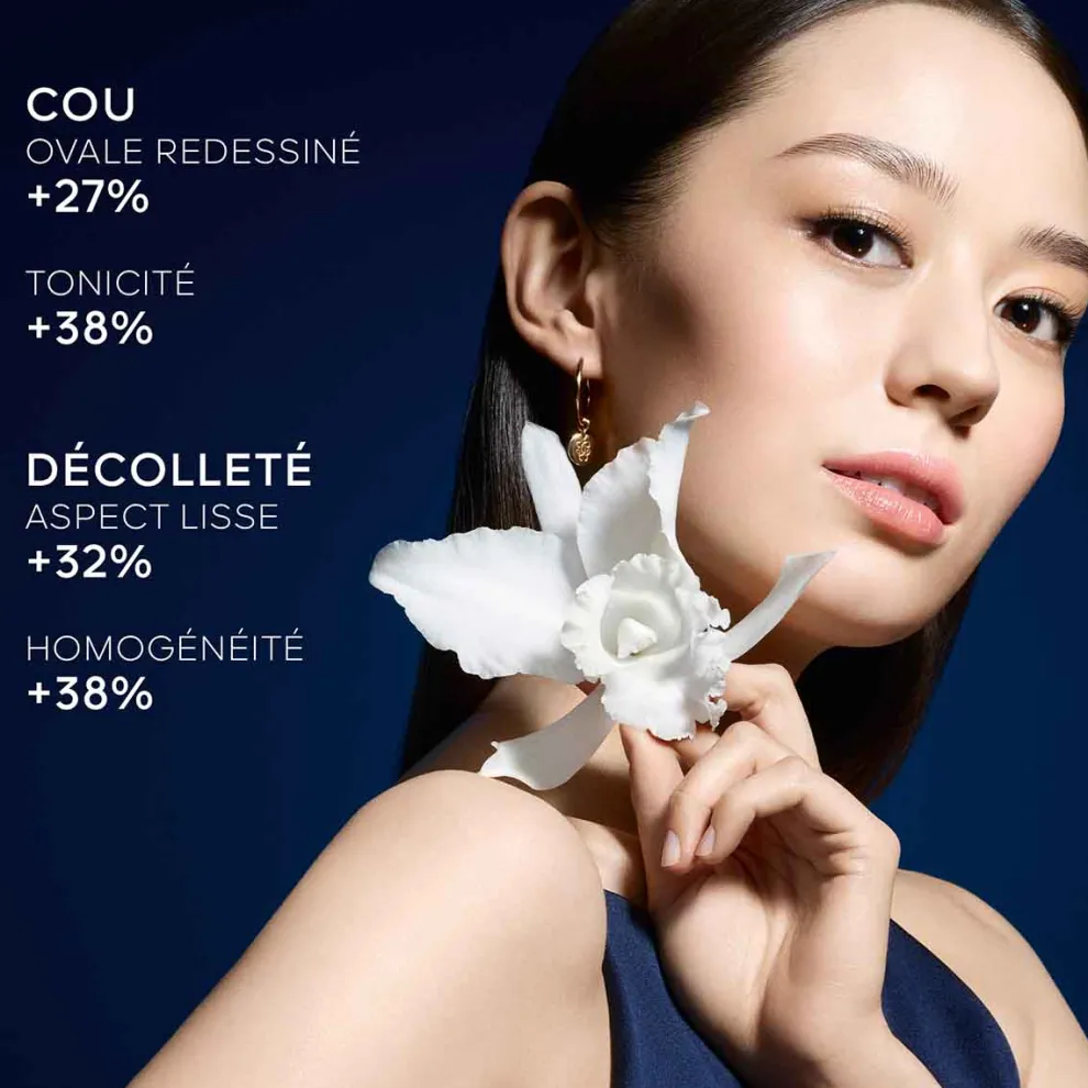 De hals en het decolleté hebben van nature een kwetsbare huid en zijn kwetsbaarder voor de tekenen van veroudering. Een gedetailleerd begrip van hun morfologie vormde de inspiratie voor de creatie van Crème Orchidée Impériale Hals en Décolleté. Deze verstevigende en hermodellerende verzorging verbetert de vorm van de huid en maakt haar zichtbaar gladder en egaler. Het combineert de Orchid Morpho-Peptideᵀᴹ technologie, die in staat is om de verankeringspunten van de huid die betrokken zijn bij het behoud van de morfologie te versterken¹, met een “Botox-achtige²” peptide, met een sterk gladstrijkend vermogen³. Geconcentreerd in een tweede-huid-formule met een omhullende textuur, dragen ze bij aan de doeltreffendheid van de crème tegen zichtbare structurele tekenen van huidveroudering. Rimpels in de hals en het decolleté worden gladgestreken, de buste wordt beter ondersteund en het ovaal van het gezicht wordt opnieuw gedefinieerd. ¹In-vitrotest op ingrediënten. ²Botox-achtig: met een werkingsmechanisme dat lijkt op dat van botox. In-vitrotest op ingrediënt.