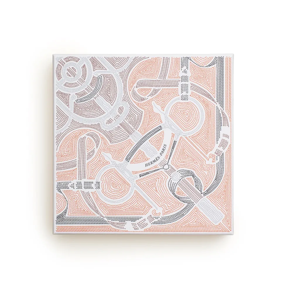 Voor Vaderdag zijn de sets van Hermès versierd met het “Éperon d’or sellier” ontwerp van Henri d’Origny. Een delicaat labyrint van gekleurde draden, als geborduurd in zadelsteek, onthult bitjes, gespen en sporen op het oranje doosje.
