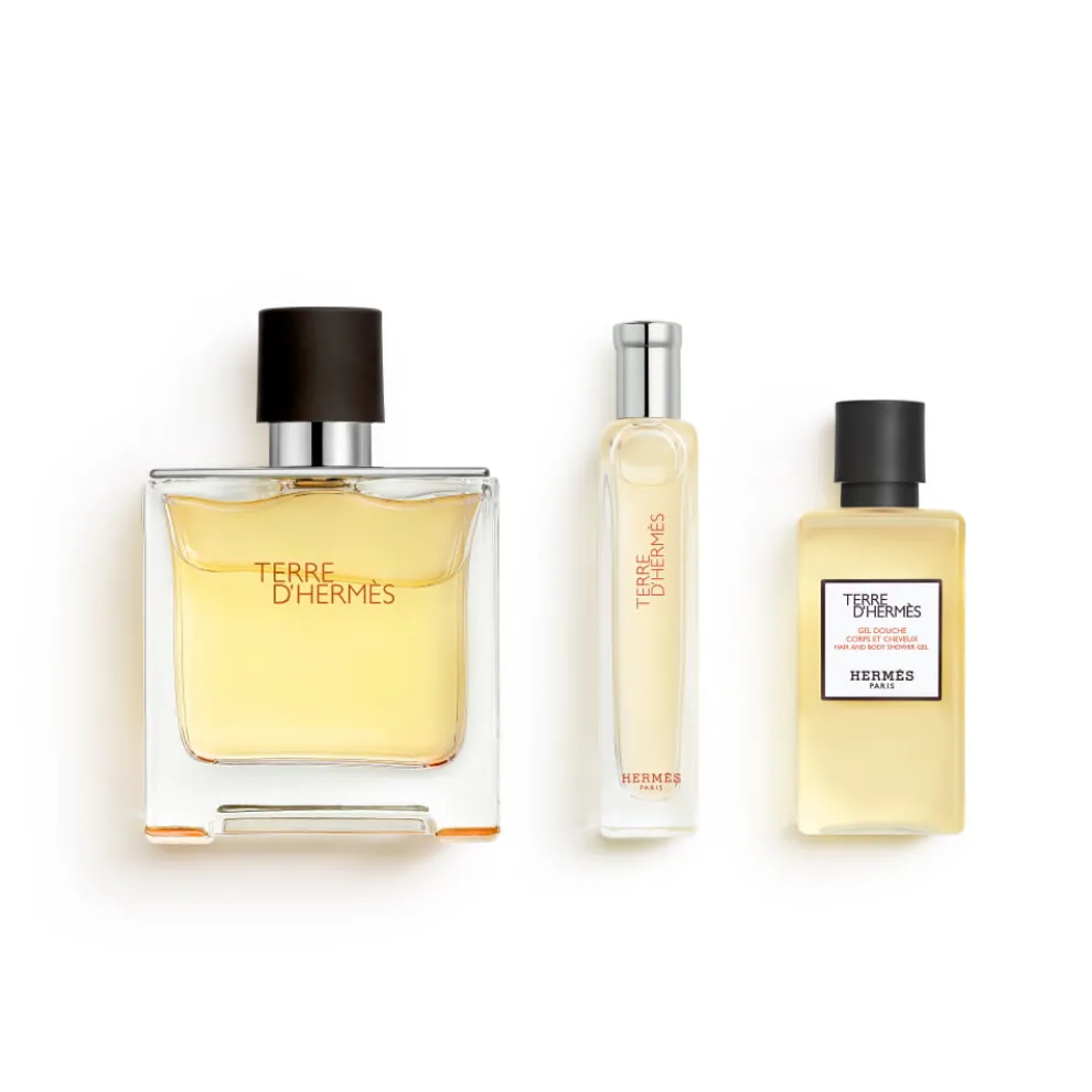 De set bevat een Parfum Terre d’Hermès van 75 ml, een Parfum Terre d’Hermès van 15 ml en een douchegel voor lichaam en haar van 40 ml.