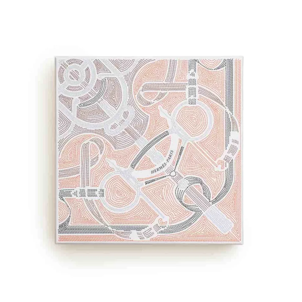 Voor Vaderdag zijn de sets van Hermès versierd met het “Éperon d’or sellier” ontwerp van Henri d’Origny. Een delicaat labyrint van gekleurde draden, als geborduurd in zadelsteek, onthult bitjes, gespen en sporen op het oranje doosje.