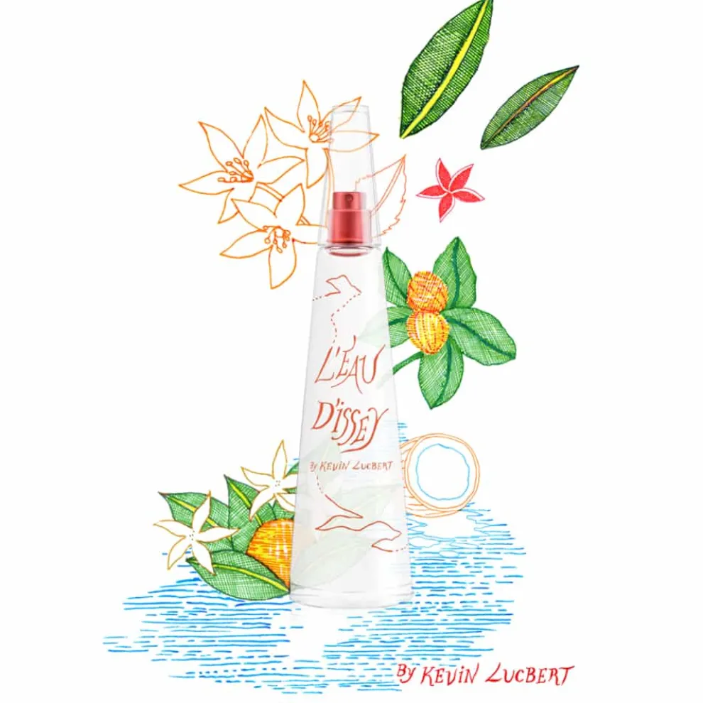 Om deze geurige emoties te illustreren heeft Kevin Lucbert, een jonge Franse kunstenaar, een gloednieuw lettertype voor L’Eau d’Issey gecreëerd, dat is getekend op een denkbeeldige kaart die deze geurige tussenstops symboliseert. Met behulp van zijn favoriete werkinstrument, de biros, stelt hij een subtiel en kleurrijk ontwerp voor, een mix tussen glinsterende planten en een schets van een onbewoond eiland.