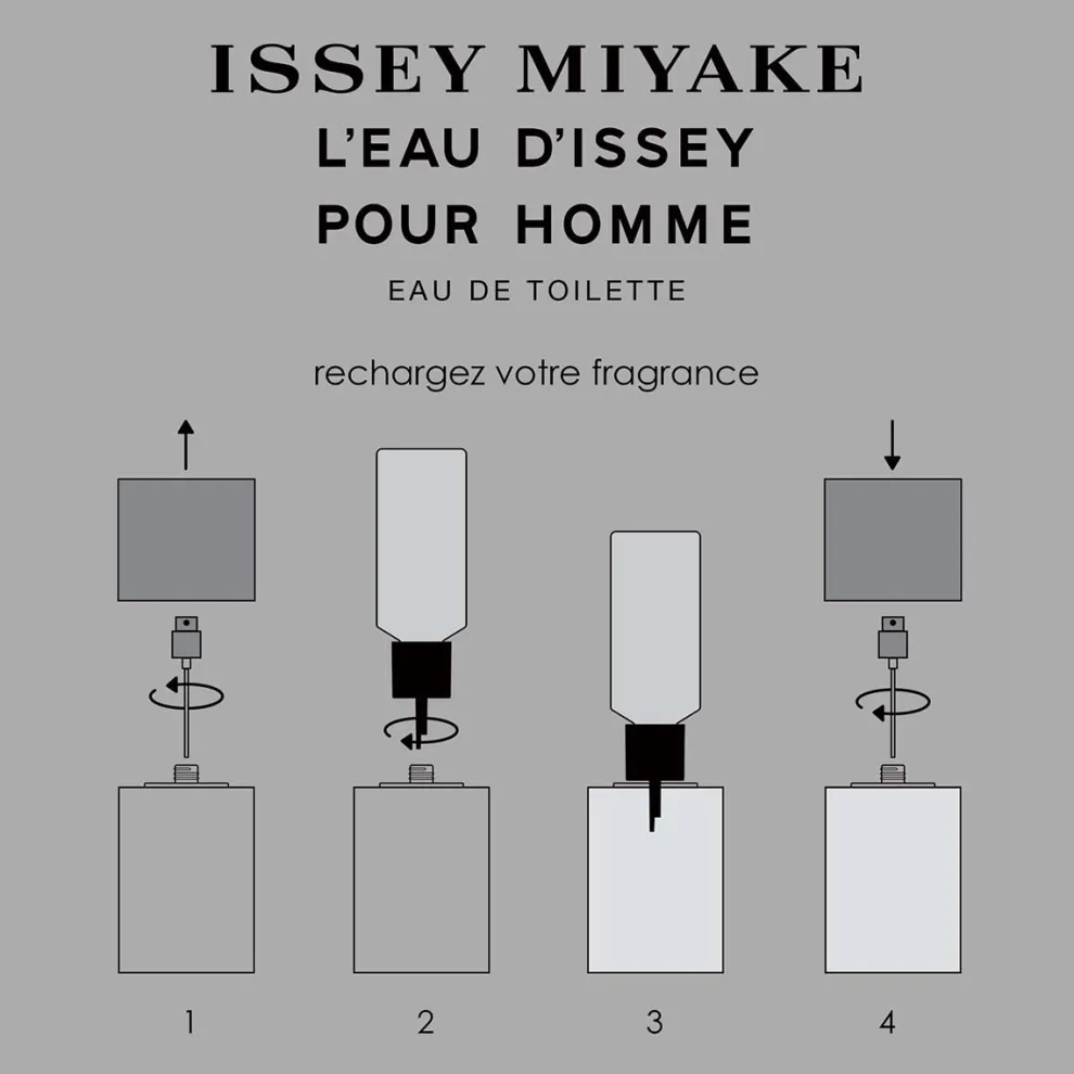 De flesjes L’Eau d’Issey Eau de Parfum 25 ml en 75 ml met de vermelding “RECHARGEABLE” kunnen bijvoorbeeld worden gevuld met de L’Eau d’Issey Eau de Parfum 75 ml navulling.