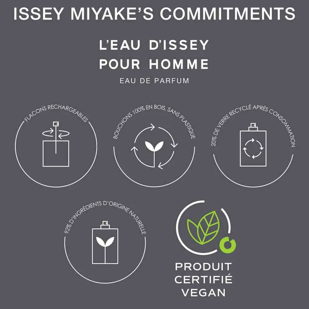 L’Eau d’Issey pour Homme Eau de parfum est certifié végan réalisé à partir de 92 % d’ingrédients d’origine naturelle.