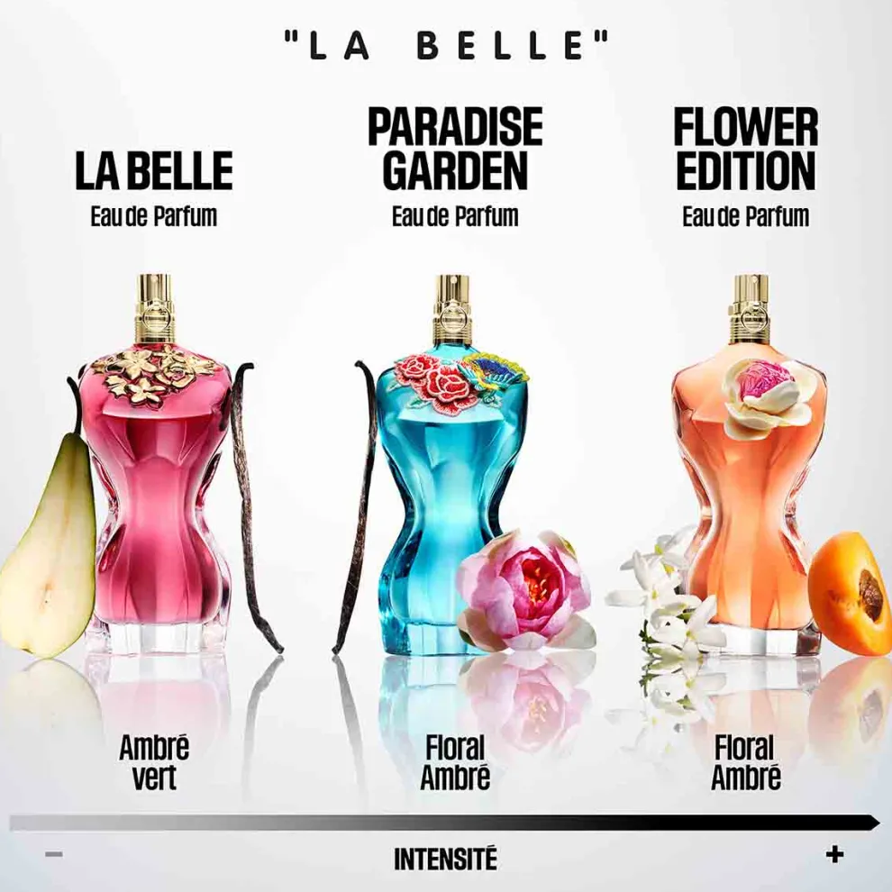 Een vrouwelijk eau de parfum met een bloemig en fruitig spoor, een betoverende belofte. In de magische, sensuele wereld van Jean Paul Gaultier betovert La Belle Flower Edition het oog met haar pracht. De gedurfde, heldere flacon is geïnspireerd op de contrasten tussen vrouwelijkheid en fascinatie, schommelend tussen zachtheid en passie. Dit parfumflesje voor vrouwen, versierd met een bloemenwezentje, wekt de diepste verlangens op. Is het de sappige abrikoos, de geur van bloeiende osmanthus of de uitbundige vanille die de zintuigen betovert? Samen creëren ze een betoverende tuin, waar elke noot een uitnodiging is tot verlangen en emotie. La Belle Flower Edition, het limited edition eau de parfum van Jean Paul Gaultier, is een bloemige ambergeur die betovert en fascineert. Stoere abrikoos en de geur van jasmijn combineren met magnolia en osmanthus voor een elegante, gedurfde geur. Vanille wordt versterkt door patchoeli en vetiver, wat verslavende, onweerstaanbare kracht toevoegt. Tussen de bloem en La Belle werkt de alchemie van emoties, voor een geur die niemand onverschillig laat.