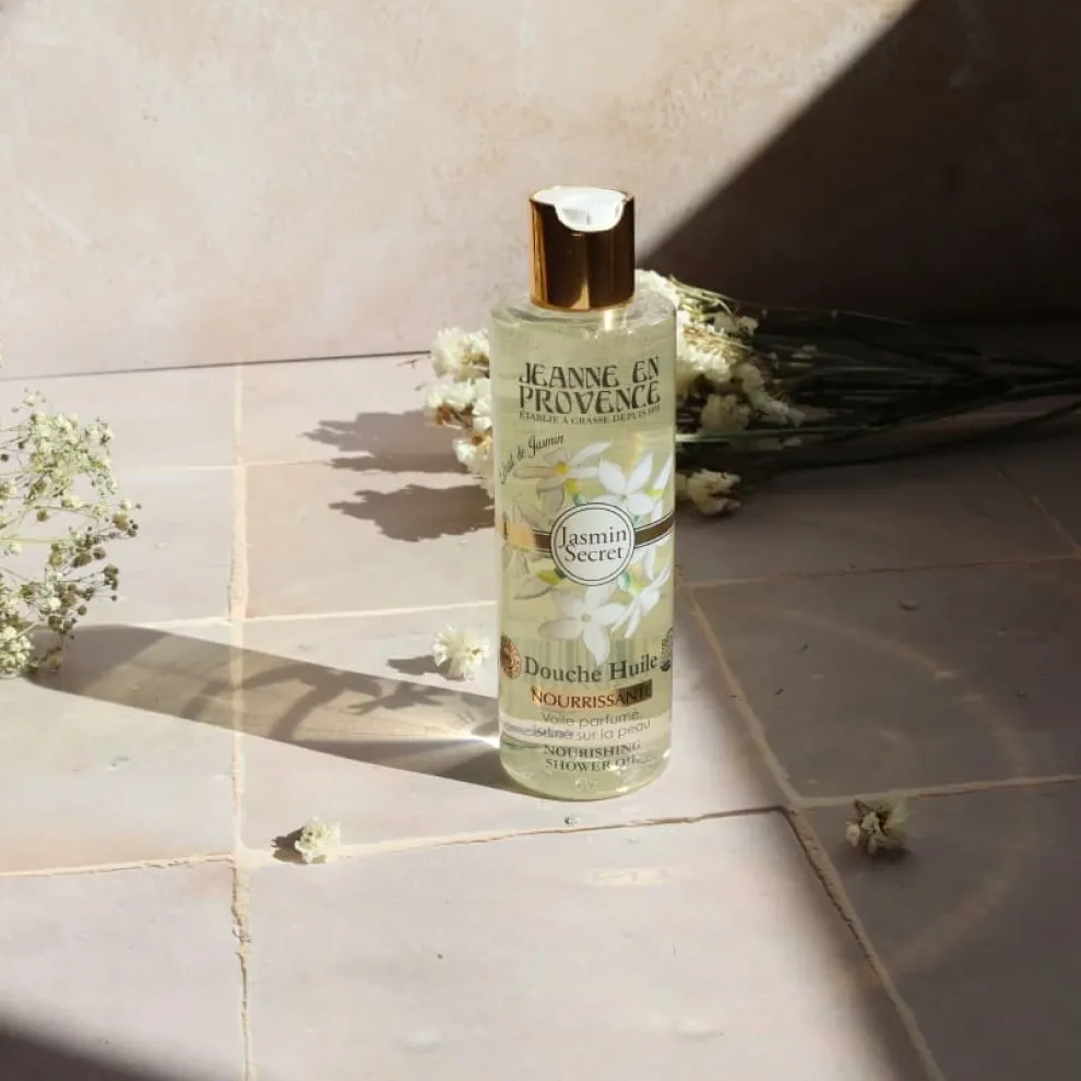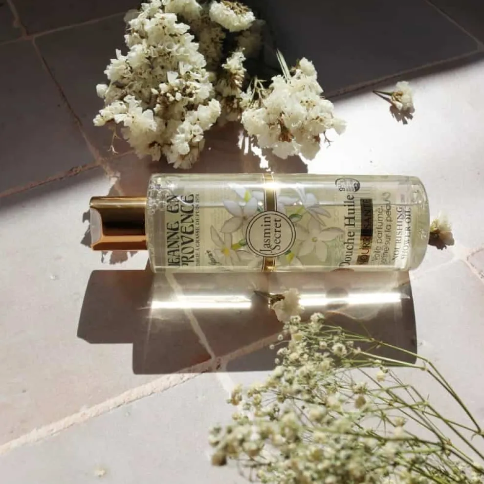 De Secret Jeanne en Provence Jasmine Oil Shower Gel, gemaakt van biologische olijfolie en plantaardige glycerine, reinigt en voedt uw huid in alle zachtheid. Hij bevat een natuurlijk extract van Jasmijnbloemen en laat een geparfumeerde en satijnachtige sluier achter op de huid.