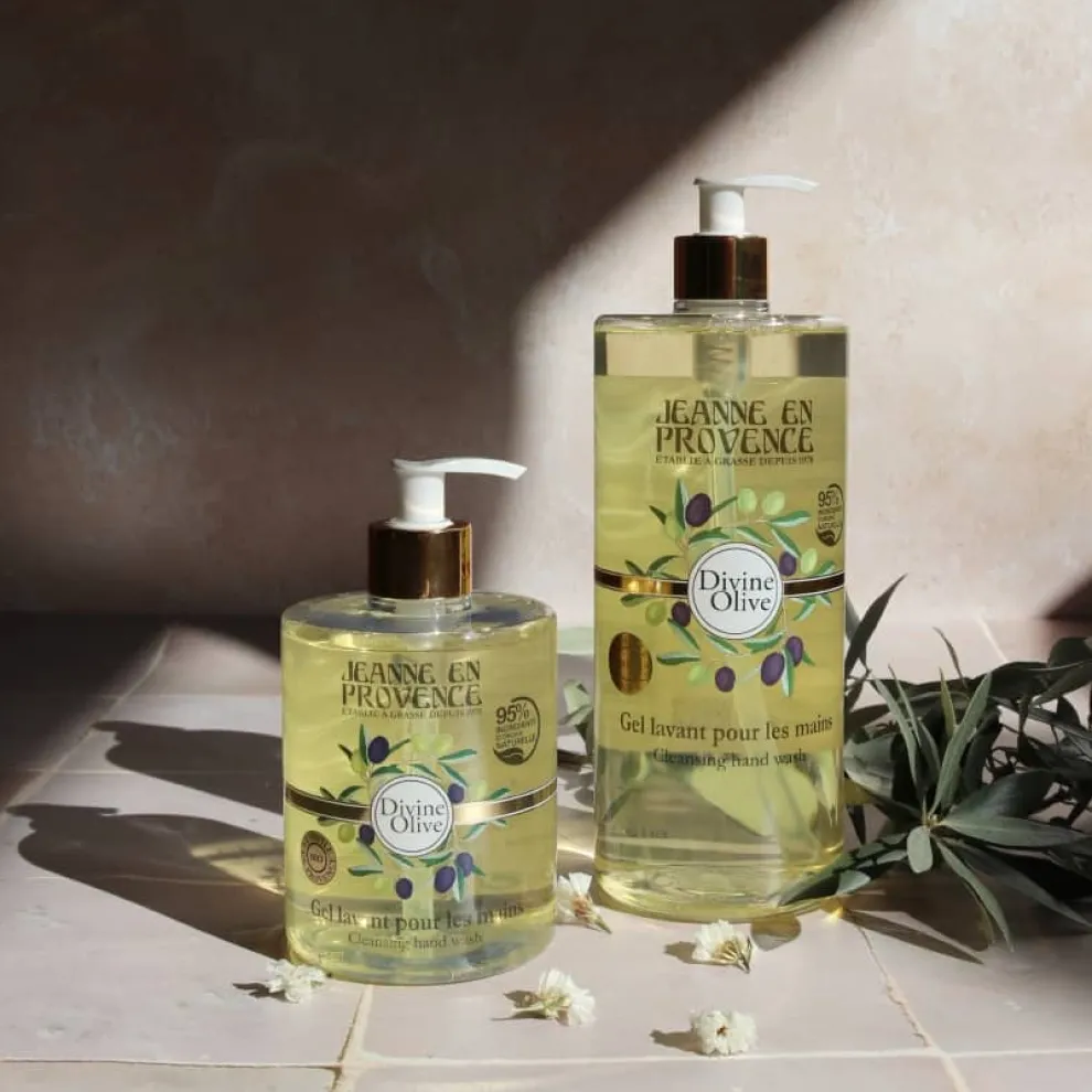 De Divine Olive Hand Washing Gel van Jeanne en Provence met biologische olijfolie reinigt en voedt uw handen. Verrijkt met glycerine, de smeuïge geltextuur met natuurlijk zeepkruidextract biedt onmiddellijk comfort en laat uw handen zacht en subtiel geparfumeerd achter.