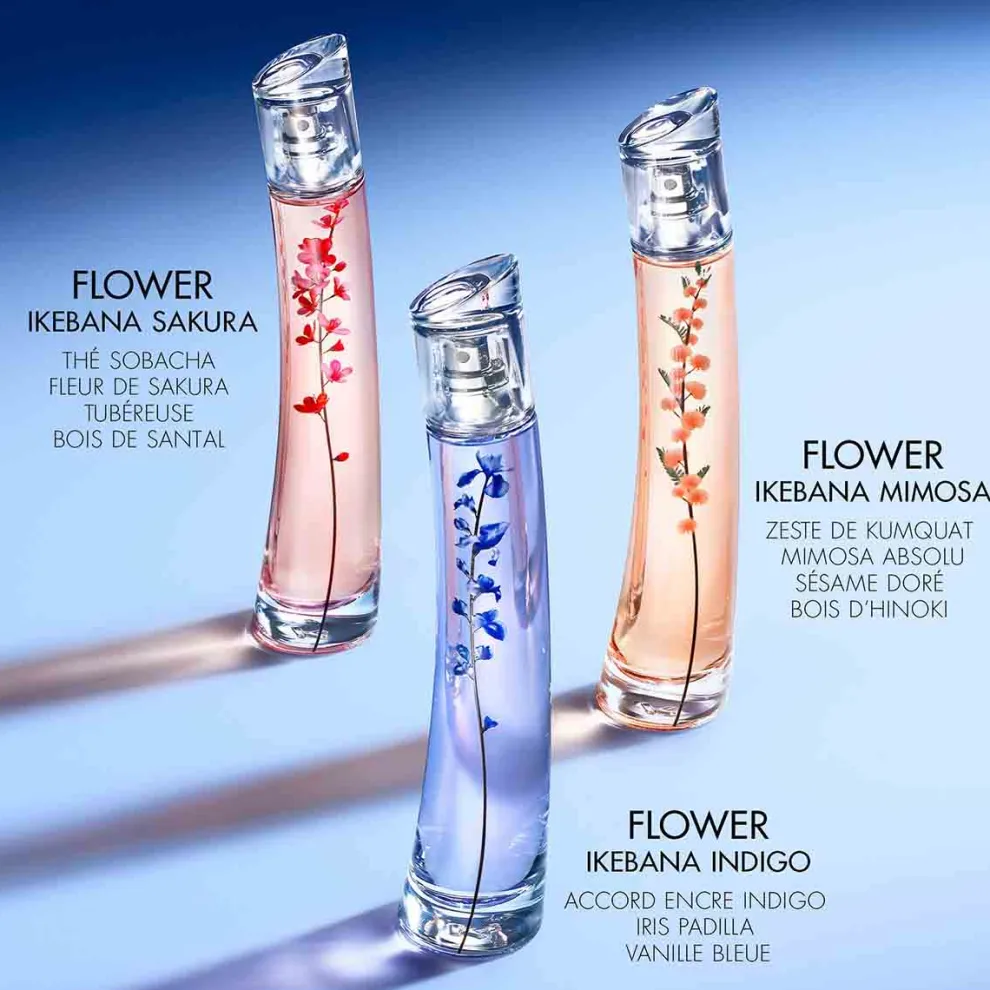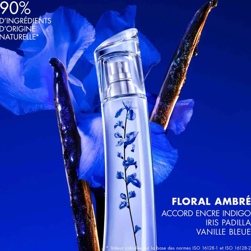 Verslavend en sensueel, deze amber bloemige compositie onthult de olfactorische kracht van een Iris getint met Encre Indigo, door middel van poederachtige, houtachtige noten. In de basis mengt het unieke minerale akkoord van Encre Indigo zich met de leerachtige, rokerige facetten van Blue Vanilla. EEN FLEK INGEÏNSPIREERD DOOR JAPAN De fles Flower Ikebana Indigo, versierd met een indigo steel, is geïnspireerd op de Japanse kakemono*. Kenzo heeft zich milieudoelstellingen gesteld die aansluiten bij zijn historische handtekening: “voor een mooiere wereld”. De flacon en dop zijn 100% glas en volledig in Frankrijk gemaakt, met 15% gerecycled glas**, en het Eau de Parfum is gemaakt met 90% ingrediënten van natuurlijke oorsprong***. DE IKEBANA COLLECTIE De Flower Ikebana collectie is een eerbetoon aan Kenzo Takada’s liefde voor bloemen en levenskunst. *Schilderen of kalligraferen bedoeld om aan de muur te hangen. **Post-consumer gerecycled volgens norm 14021. ***Waarde berekend op basis van ISO 16128-1 en ISO 16128-2 normen.