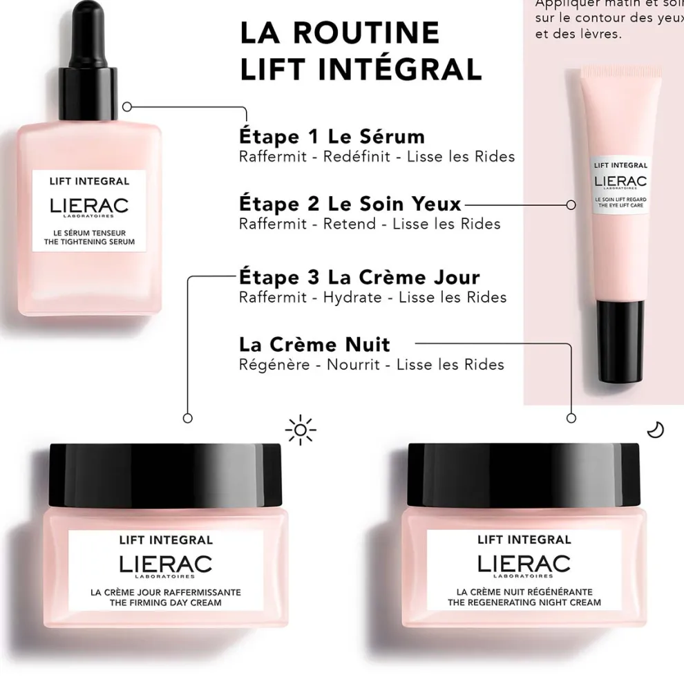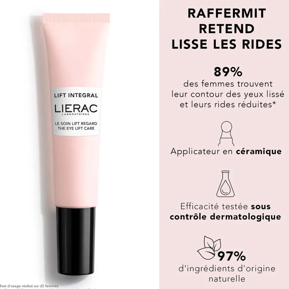 Integral Lift Eye Care versterkt de huidstructuur door in te werken op de essentiële elementen (collageen, elastine, hyaluronzuur) en op de glycoproteïnen die ze met elkaar verbinden. De huid wordt weer stevig, elastisch en veerkrachtig, voor een totaal liftend effect. De fijne, smeltende textuur van Soin Lift Regard sublimeert en egaliseert de oogcontour. De keramische punt geeft onmiddellijk een fris gevoel voor een optimale doeltreffendheid. Deze behandeling kan ook worden toegepast op de tere lipcontouren. Geschikt voor alle huidtypes, zelfs de gevoelige*.