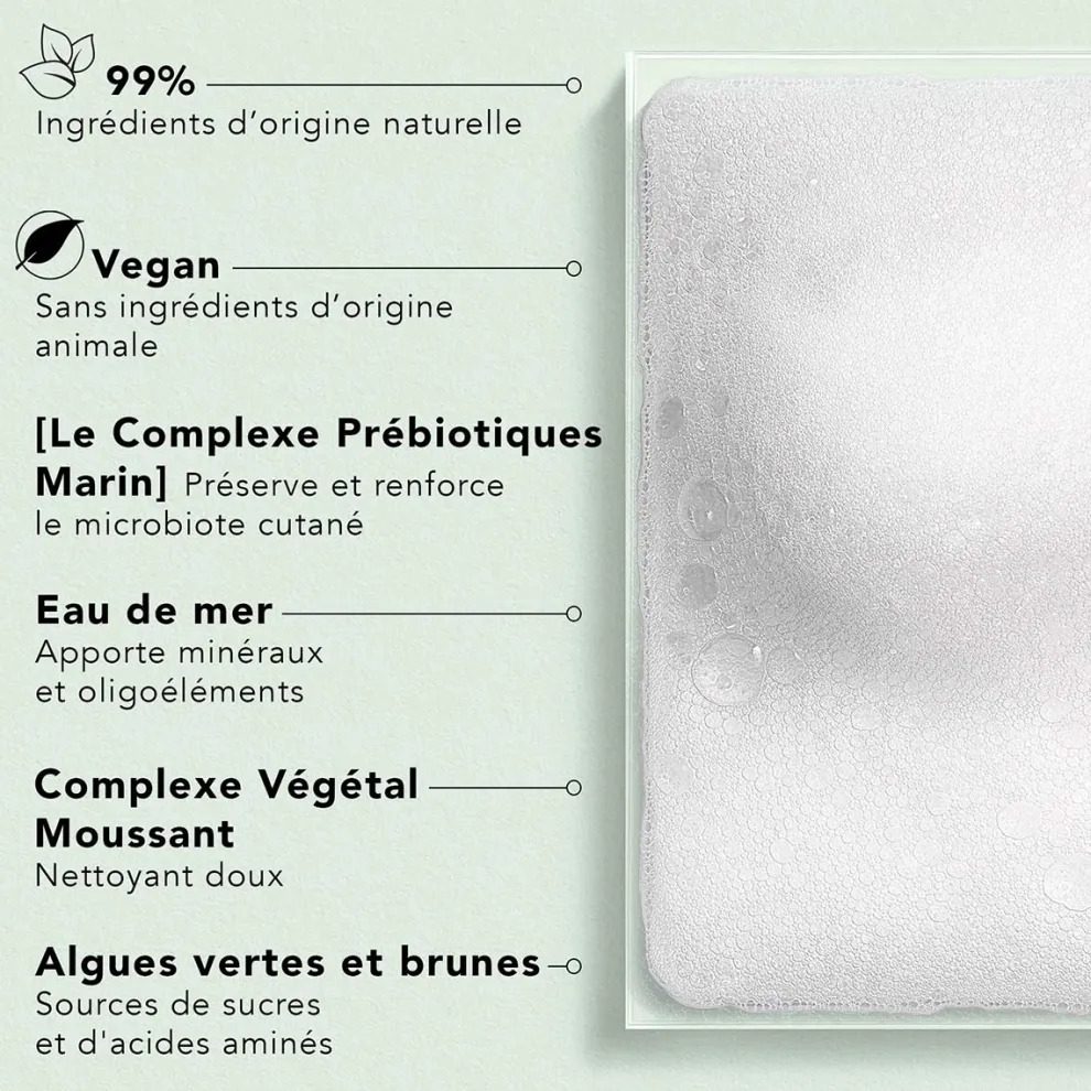 Cleansing Foam is gemaakt van 99% natuurlijke ingrediënten en zuivert en kalmeert de huid op milde wijze. De kern van de formule wordt gevormd door het Marine Prebiotic Complex dat de microbiota van de huid in stand houdt en versterkt. De gulle, luchtige schuimtextuur is een waar genot om aan te brengen en maakt de huid schoon, zacht en gekalmeerd. Geschikt voor alle huidtypes, zelfs de gevoelige huid. VEGAN* Dermatologisch getest. Made in France *Geeft geen ingrediënten van dierlijke oorsprong.