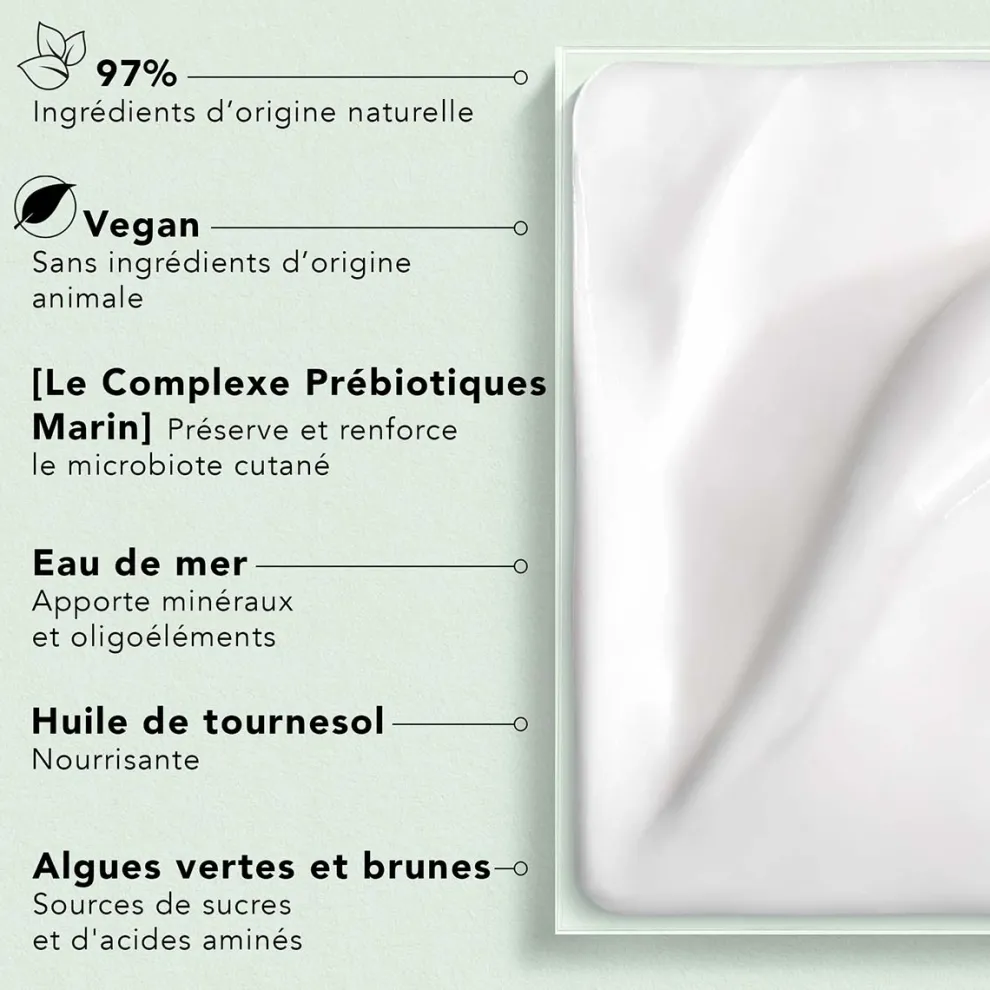 Le Lait Démaquillant, gemaakt van 97% natuurlijke ingrediënten, reinigt en verwijdert make-up van gezicht en ogen op milde wijze en laat de huid direct comfortabel aanvoelen. De kern van de formule wordt gevormd door het Marine Prebiotic Complex dat de microbiota van de huid in stand houdt en versterkt. De lichte, niet-vette fluweelzachte textuur hult de huid in een sluier van zachtheid. Het maakt de huid perfect schoon, soepel en gevoed. Geschikt voor alle huidtypes, zelfs de gevoelige huid. VEGAN* Getest onder dermatologische en oftalmologische controle. Made in France *Geeft geen ingrediënten van dierlijke oorsprong.