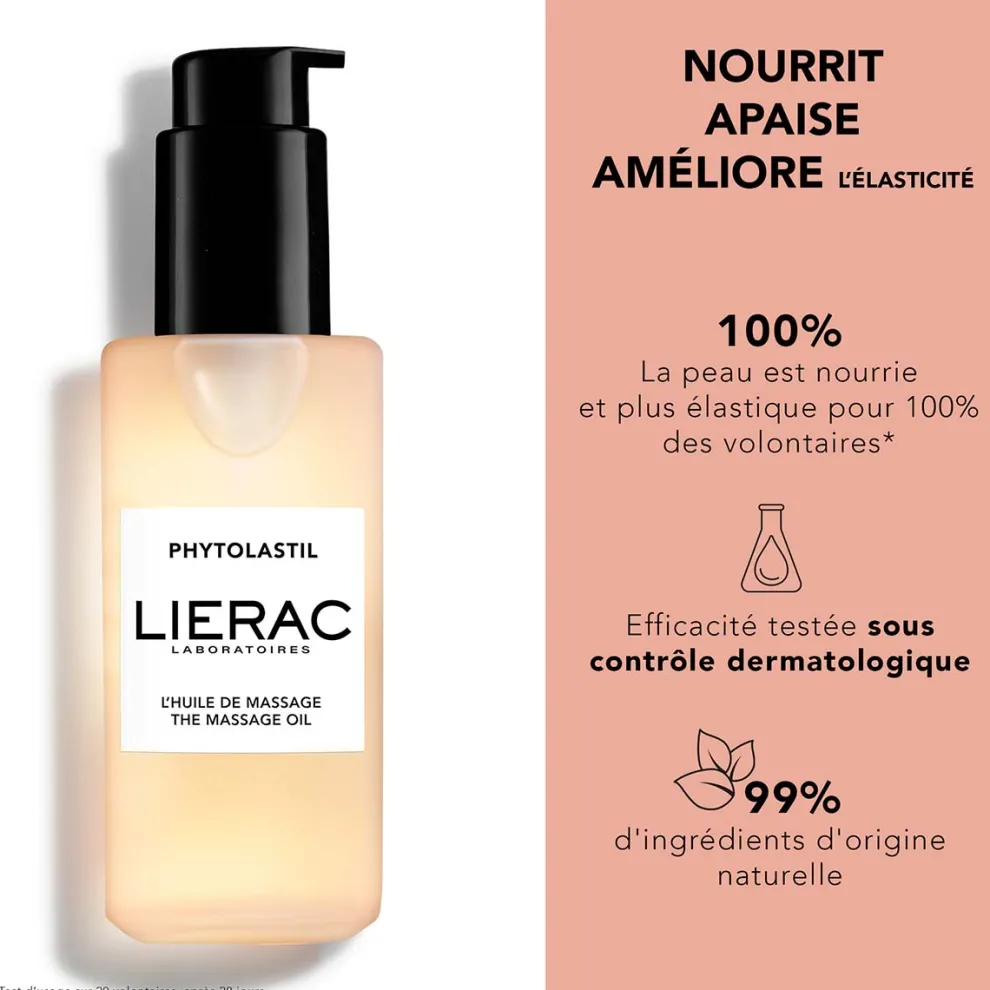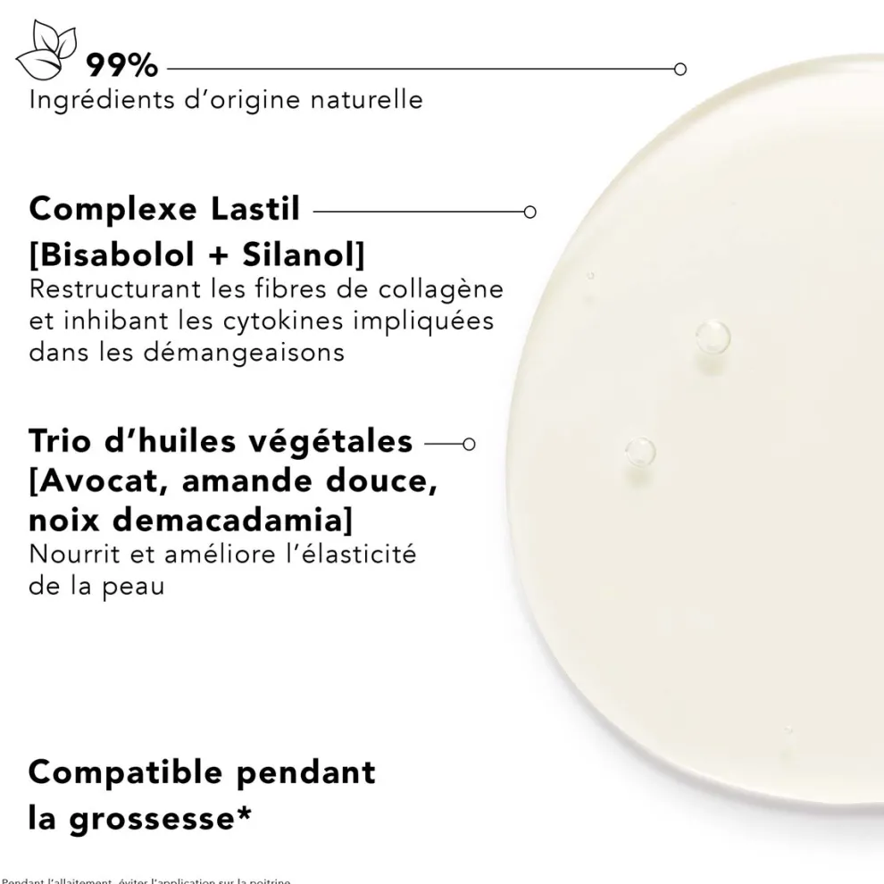 Dankzij de unieke combinatie van het Lastil-complex [Bisabolol + Silanol] en een trio van plantaardige oliën [avocado + zoete amandel + macadamianoot] verbetert de massageolie de elasticiteit van de huid, voedt ze en verlicht ze jeuk om het verschijnen van striae te voorkomen.