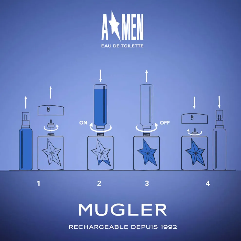 A*Men is de geur voor de zelfverzekerde en avontuurlijke man. A*men van MUGLER is een geur uit de houtige oriëntaalse familie die de viriliteit van een gebeeldhouwd lichaam oproept door de houtige patchouli noten en de gedurfde kracht van de held door de koffie absolute noten. Een vurige, volle geur met een intens karakter en houtachtige energie die de essentie van de held in elke man onthult. Stoutmoedig, intens en fascinerend, A*Men belichaamt een authentieke en innovatieve visie op de hedendaagse held. Deze krachtige mannelijke geur combineert elegantie, raffinement en charisma in twee olfactorische dimensies. De houtachtige, mannelijke noten van patchoeli vermengd met Bourbon vanille trillen van intensiteit en viriliteit. ARDENTE DIMENSIE In overdosis gebruikt, geeft de noot van Café Absolu een vol en resoluut mannelijk karakter aan het parfum. De zwarte rubberen flacon van A*Men voelt aan als een tweede huid en de taps toelopende lijnen doen denken aan reisflesjes, wat zorgt voor een energieke en viriele greep.