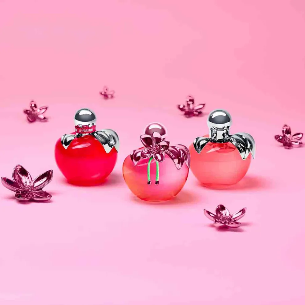Nina’s iconische appelflacon is versierd in zijn mooiste iriserende roze, met een bloemenjuweel als accessoire bij dit kostbare geschenk. Het doosje bevat een laatste verrassing: een dromerige illustratie van de Nina-appel.
