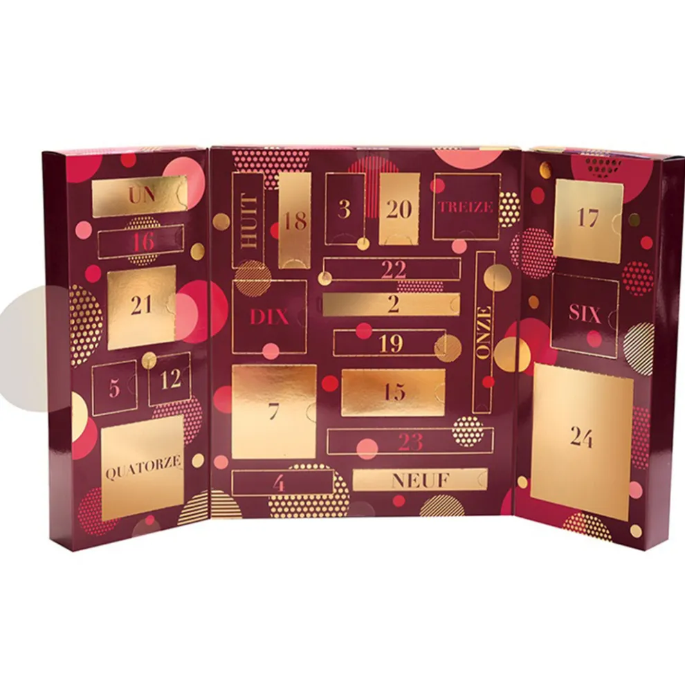 MAKE-UP ADVENT KALENDER – FESTIF FEELING Verwen jezelf voor Kerstmis met de limited edition Festif feeling kalender. Ontdek elke dag 24 prachtige make-up en accessoire verrassingen. Bevat: 1 Palette 4 Oogschaduwen, 1 Palette Illuminator, 1 Palette Blush, 1 Strass Board, 1 Palette 3 Cream Eyeshadows, 2 Glosses, 1 Lipstick, 1 Jumbo Potlood, 1 Stick 3 in 1, 1 Mascara, 1 Eyeliner, 1 Vloeibare Oogschaduw, 2 Glitterpoeders, 2 Oogpotloden, 1 Lippotlood, 2 Nagellak, 1 Spiegel, 1 Duo Borstel, 1 Grote Haar Elastiek, 1 Cosmetisch Zakje. Afmetingen: 24 x 29 x 7 cm.