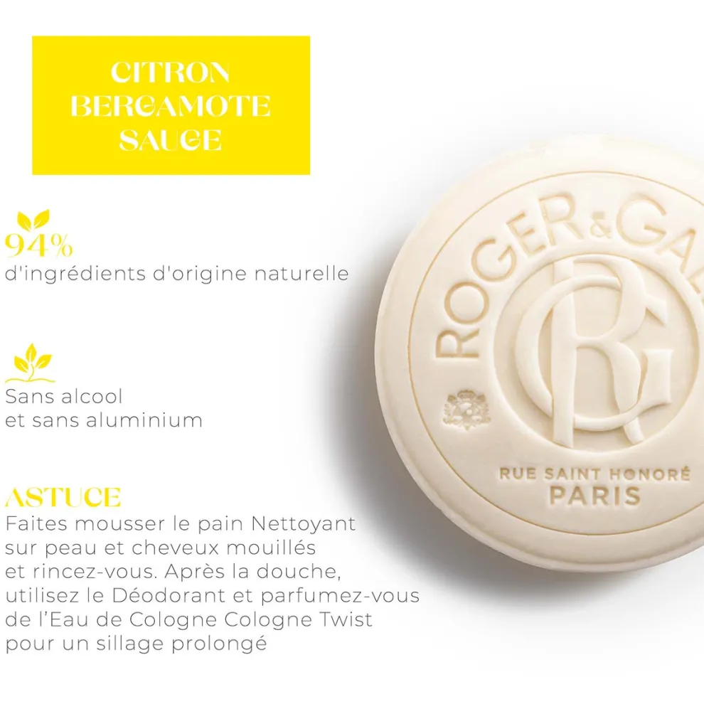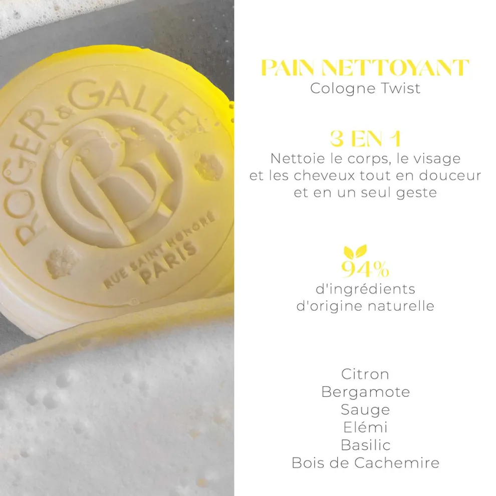 | Effect | Te gebruiken voor lichaam, gezicht en haar Het resultaat van de gedegen expertise van Roger&Gallet. De Cologne Twist Cleansing Bar reinigt en hydrateert lichaam en gezicht in alle zachtheid en geeft het haar weer vitaliteit. Een praktische en ecologische 3-in-1! |