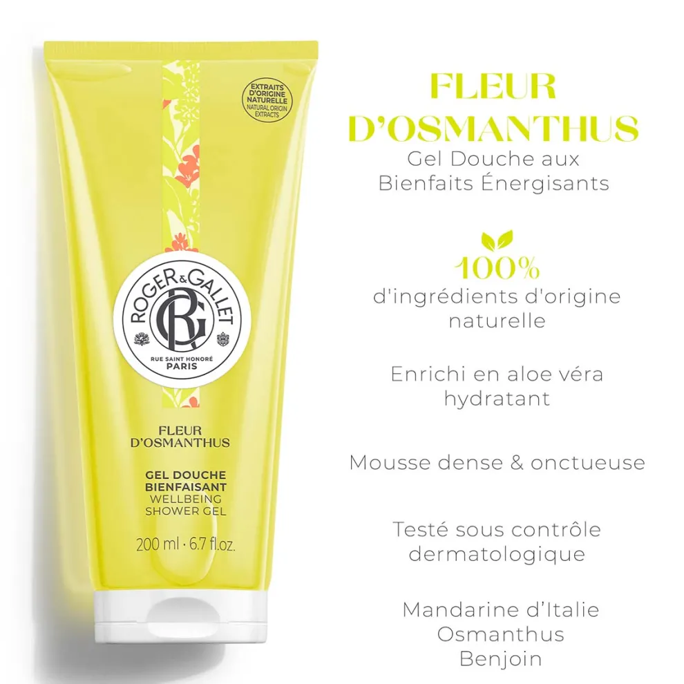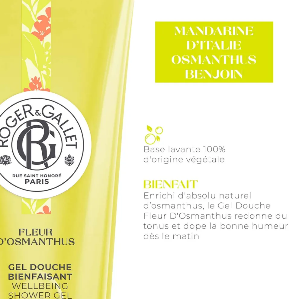Herontdek de euforische smaak van de eerste mooie dagen, de zachtheid van een arm vol lichte bloemen. Fleur d’Osmanthus Beneficial Shower Gel, met zijn romige schuim, voert ons mee met de geur van abrikozenbloemen en de zonnige frisheid van Italiaanse mandarijn. De reinigende basis is 100% plantaardig, verrijkt met energieke natuurlijke osmanthus absolue en aloë vera, voor een ultrazachte toepassing en gemakkelijk afspoelen. Onder de douche of in bad, het fijne, gulle schuim hydrateert je huid en geurt heerlijk naar de abrikozenbloesem van Osmanthusbloem.