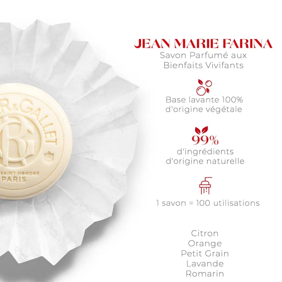 | Effect | Natuurlijk verkwikkende Jean Marie Farina Geparfumeerde Zeep is verrijkt met natuurlijke Rozemarijn Essentie met verkwikkende eigenschappen voor lichaam en geest. |