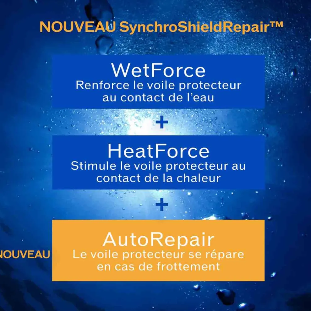 SynchroShieldRepair™ met HeatForce x WetForce x AutoRepair om de beschermende sluier te versterken bij blootstelling aan water, zweet en hitte*.